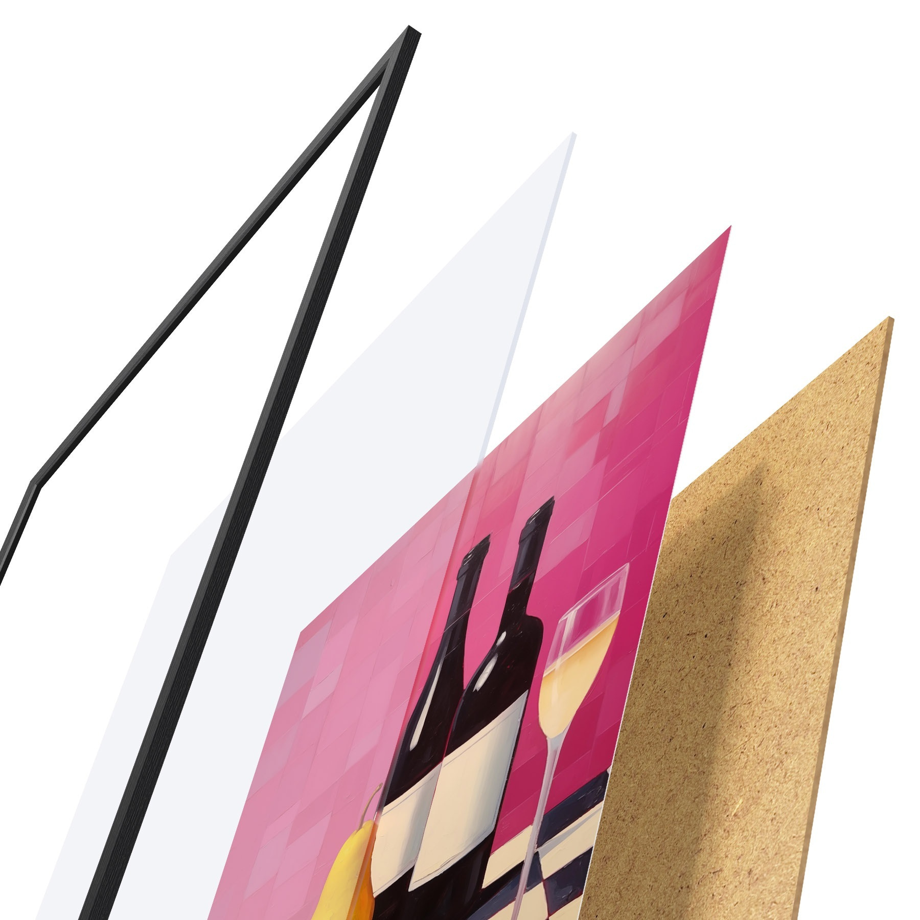 Das Poster besteht aus einem Rahmen, Plexiglas, einem gedruckten Bild und einer Rückwand aus Spanplatten. Dank der Halterungen auf der Rückseite kann das Poster sofort an die Wand gehängt werden.
