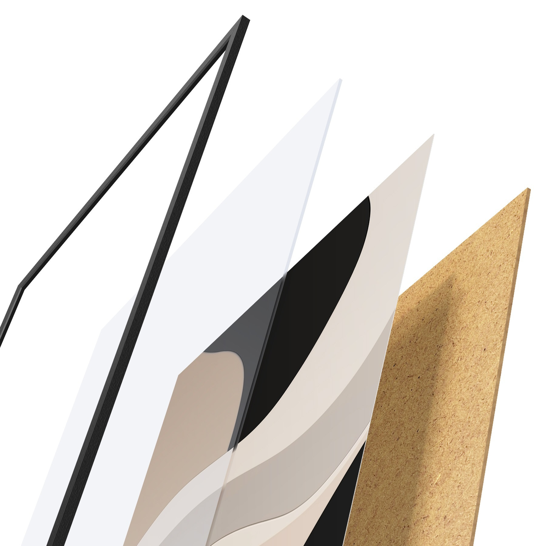 Das Poster besteht aus einem Rahmen, Plexiglas, einem gedruckten Bild und einer Rückwand aus Spanplatten. Dank der Halterungen auf der Rückseite kann das Poster sofort an die Wand gehängt werden.