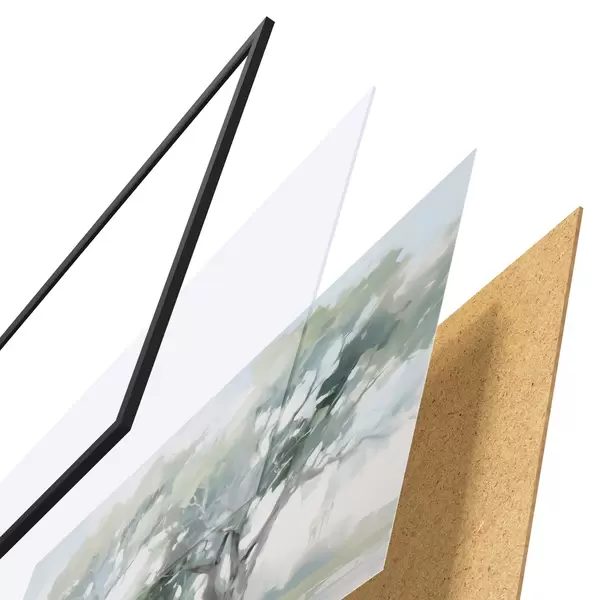 Das Poster besteht aus einem Rahmen, Plexiglas, einem gedruckten Bild und einer Rückwand aus Spanplatten. Dank der Halterungen auf der Rückseite kann das Poster sofort an die Wand gehängt werden.