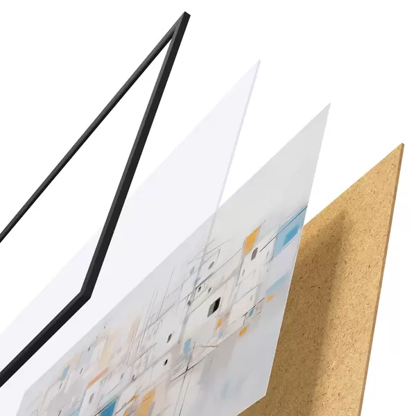 Das Poster besteht aus einem Rahmen, Plexiglas, einem gedruckten Bild und einer Rückwand aus Spanplatten. Dank der Halterungen auf der Rückseite kann das Poster sofort an die Wand gehängt werden.