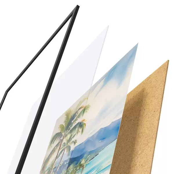 Das Poster besteht aus einem Rahmen, Plexiglas, einem gedruckten Bild und einer Rückwand aus Spanplatten. Dank der Halterungen auf der Rückseite kann das Poster sofort an die Wand gehängt werden.