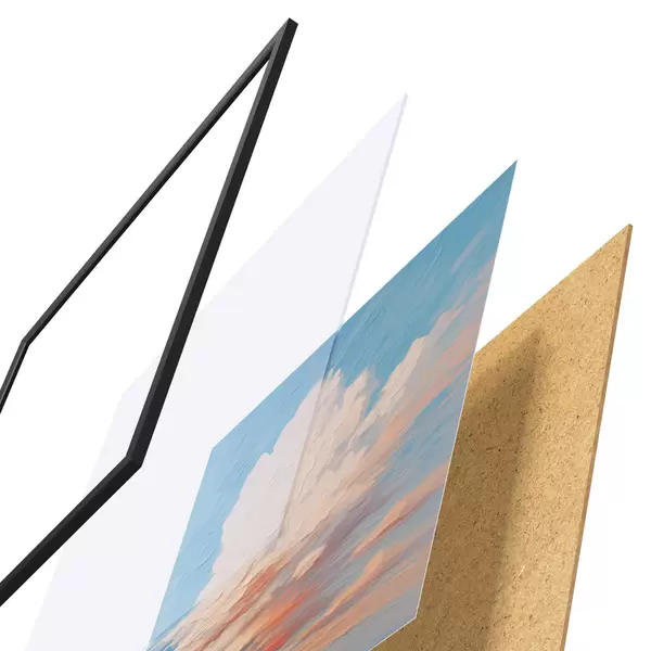 Das Poster besteht aus einem Rahmen, Plexiglas, einem gedruckten Bild und einer Rückwand aus Spanplatten. Dank der Halterungen auf der Rückseite kann das Poster sofort an die Wand gehängt werden.