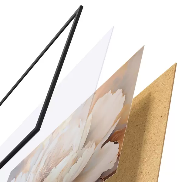 Das Poster besteht aus einem Rahmen, Plexiglas, einem gedruckten Bild und einer Rückwand aus Spanplatten. Dank der Halterungen auf der Rückseite kann das Poster sofort an die Wand gehängt werden.