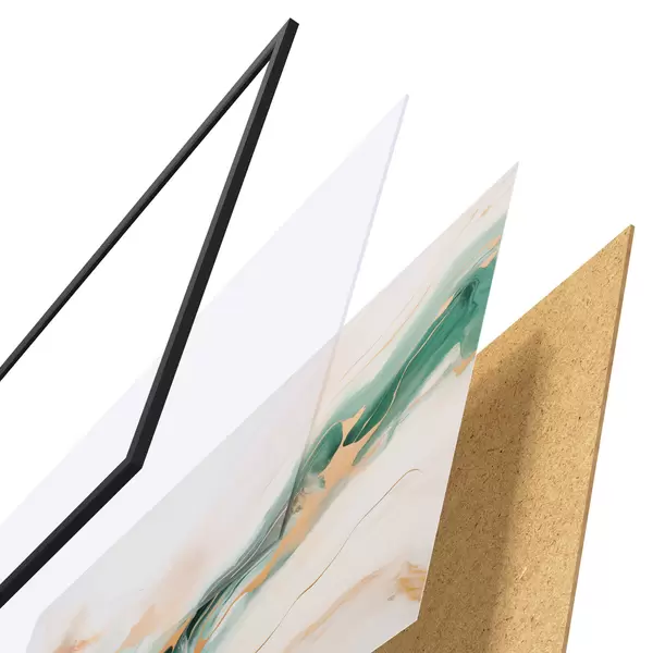 Das Poster besteht aus einem Rahmen, Plexiglas, einem gedruckten Bild und einer Rückwand aus Spanplatten. Dank der Halterungen auf der Rückseite kann das Poster sofort an die Wand gehängt werden.