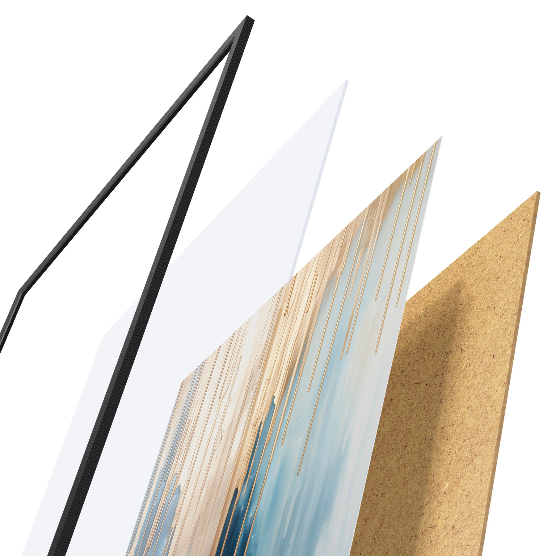 Das Poster besteht aus einem Rahmen, Plexiglas, einem gedruckten Bild und einer Rückwand aus Spanplatten. Dank der Halterungen auf der Rückseite kann das Poster sofort an die Wand gehängt werden.