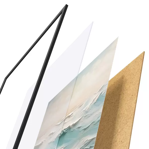 Das Poster besteht aus einem Rahmen, Plexiglas, einem gedruckten Bild und einer Rückwand aus Spanplatten. Dank der Halterungen auf der Rückseite kann das Poster sofort an die Wand gehängt werden.