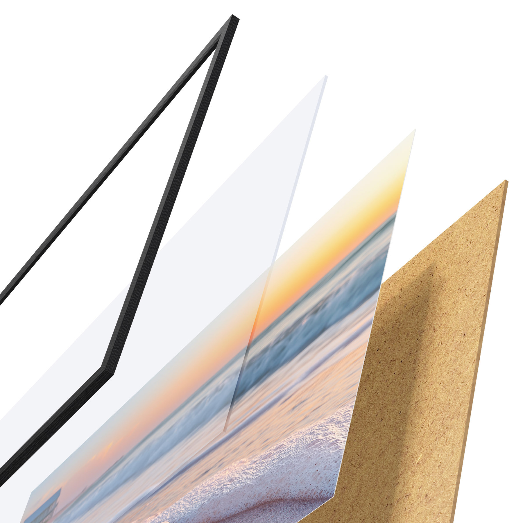 Das Poster besteht aus einem Rahmen, Plexiglas, einem gedruckten Bild und einer Rückwand aus Spanplatten. Dank der Halterungen auf der Rückseite kann das Poster sofort an die Wand gehängt werden.