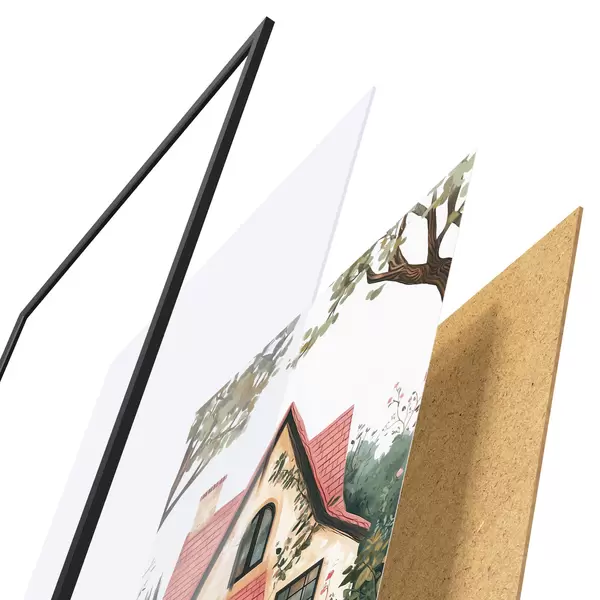 Das Poster besteht aus einem Rahmen, Plexiglas, einem gedruckten Bild und einer Rückwand aus Spanplatten. Dank der Halterungen auf der Rückseite kann das Poster sofort an die Wand gehängt werden.