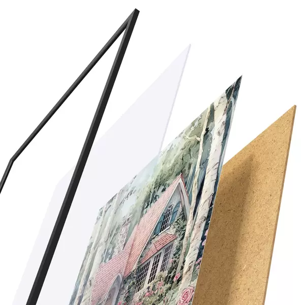 Das Poster besteht aus einem Rahmen, Plexiglas, einem gedruckten Bild und einer Rückwand aus Spanplatten. Dank der Halterungen auf der Rückseite kann das Poster sofort an die Wand gehängt werden.