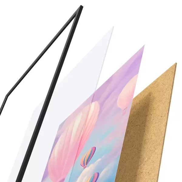 Das Poster besteht aus einem Rahmen, Plexiglas, einem gedruckten Bild und einer Rückwand aus Spanplatten. Dank der Halterungen auf der Rückseite kann das Poster sofort an die Wand gehängt werden.