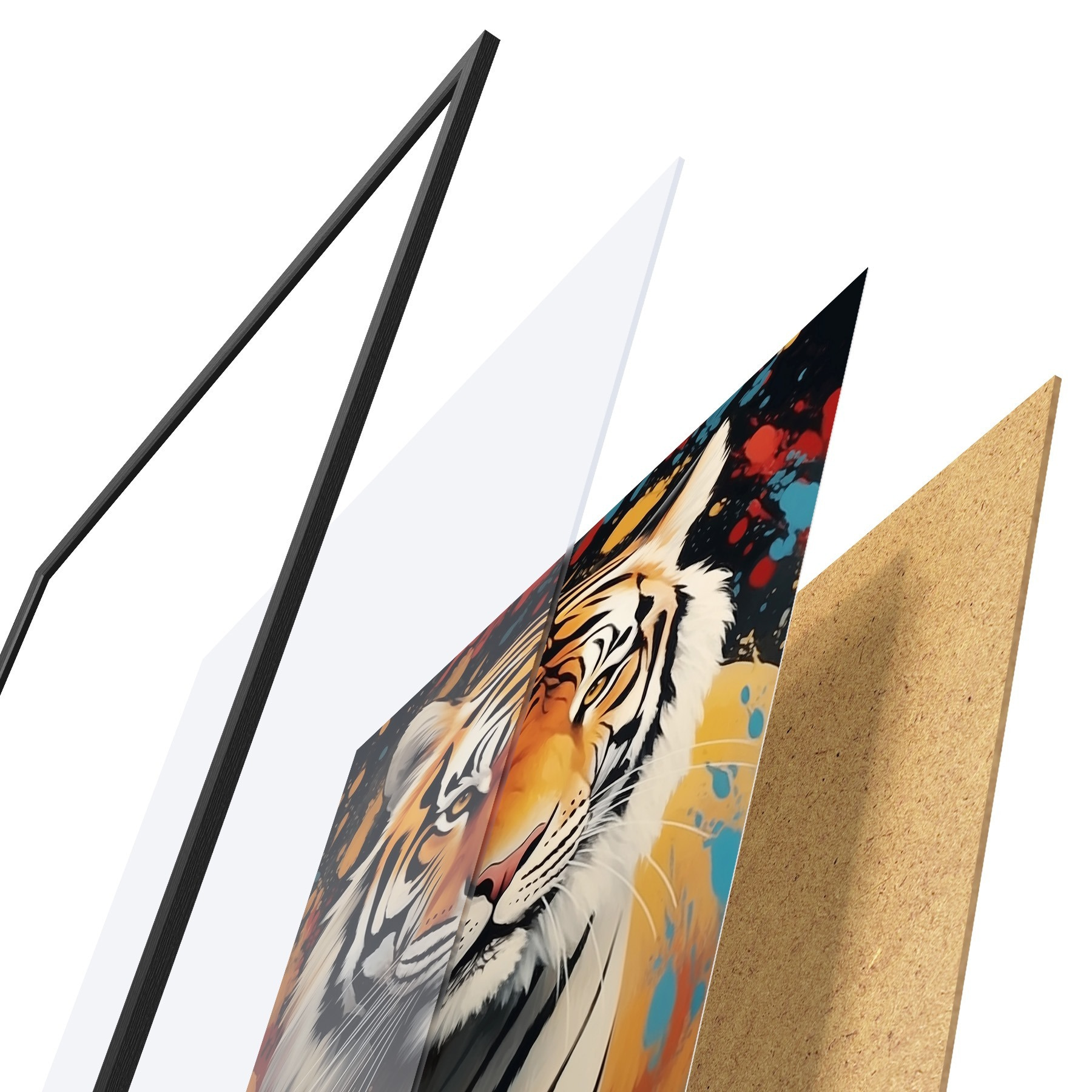Das Poster besteht aus einem Rahmen, Plexiglas, einem gedruckten Bild und einer Rückwand aus Spanplatten. Dank der Halterungen auf der Rückseite kann das Poster sofort an die Wand gehängt werden.