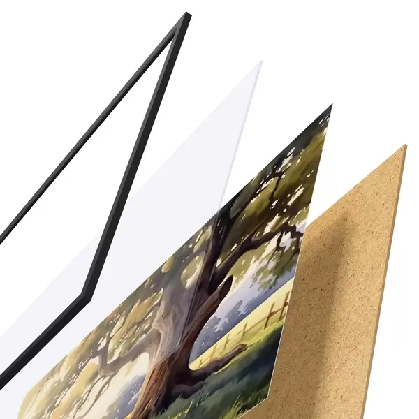 Das Poster besteht aus einem Rahmen, Plexiglas, einem gedruckten Bild und einer Rückwand aus Spanplatten. Dank der Halterungen auf der Rückseite kann das Poster sofort an die Wand gehängt werden.