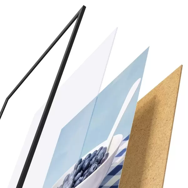 Das Poster besteht aus einem Rahmen, Plexiglas, einem gedruckten Bild und einer Rückwand aus Spanplatten. Dank der Halterungen auf der Rückseite kann das Poster sofort an die Wand gehängt werden.