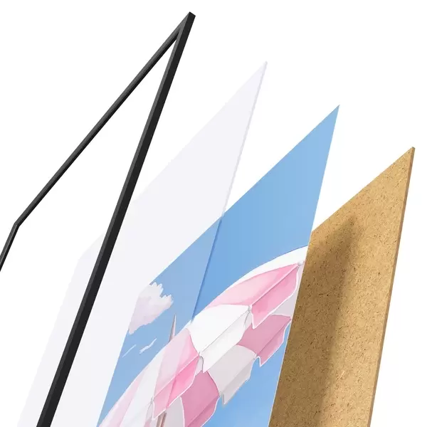 Das Poster besteht aus einem Rahmen, Plexiglas, einem gedruckten Bild und einer Rückwand aus Spanplatten. Dank der Halterungen auf der Rückseite kann das Poster sofort an die Wand gehängt werden.