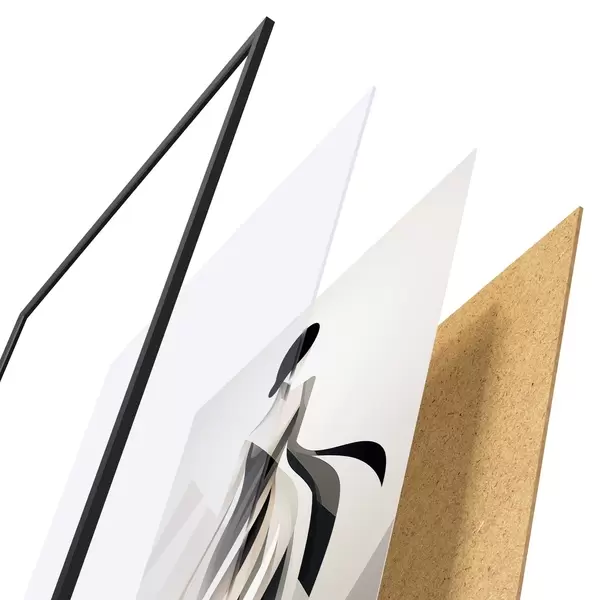 Das Poster besteht aus einem Rahmen, Plexiglas, einem gedruckten Bild und einer Rückwand aus Spanplatten. Dank der Halterungen auf der Rückseite kann das Poster sofort an die Wand gehängt werden.
