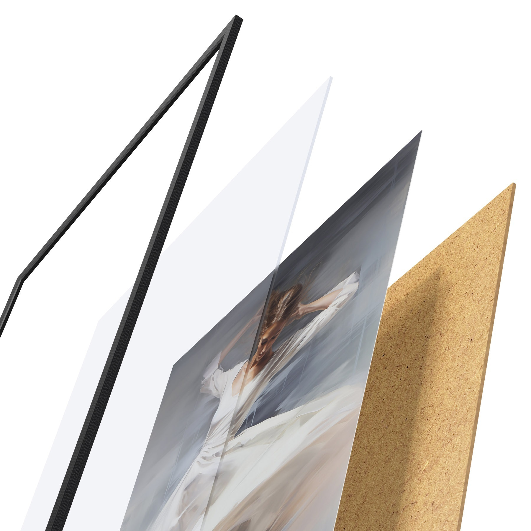 Das Poster besteht aus einem Rahmen, Plexiglas, einem gedruckten Bild und einer Rückwand aus Spanplatten. Dank der Halterungen auf der Rückseite kann das Poster sofort an die Wand gehängt werden.