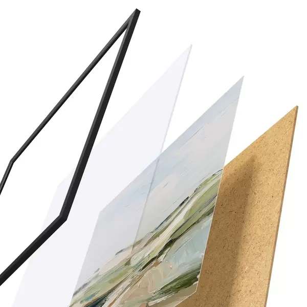 Das Poster besteht aus einem Rahmen, Plexiglas, einem gedruckten Bild und einer Rückwand aus Spanplatten. Dank der Halterungen auf der Rückseite kann das Poster sofort an die Wand gehängt werden.