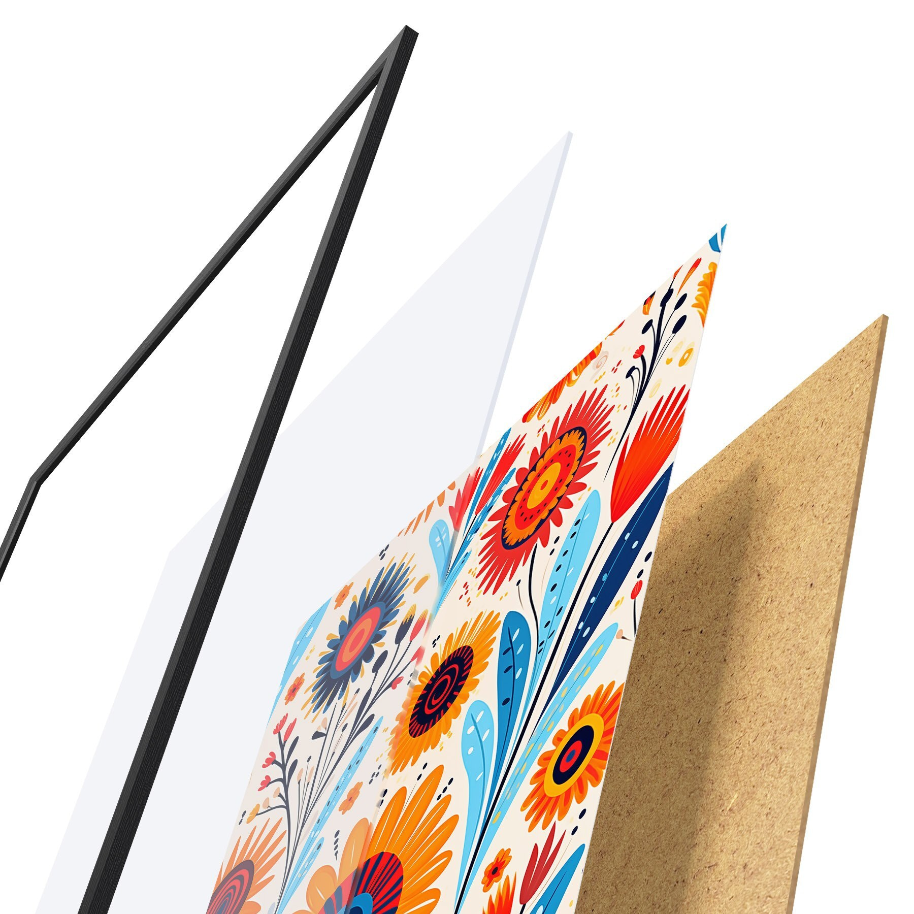 Das Poster besteht aus einem Rahmen, Plexiglas, einem gedruckten Bild und einer Rückwand aus Spanplatten. Dank der Halterungen auf der Rückseite kann das Poster sofort an die Wand gehängt werden.