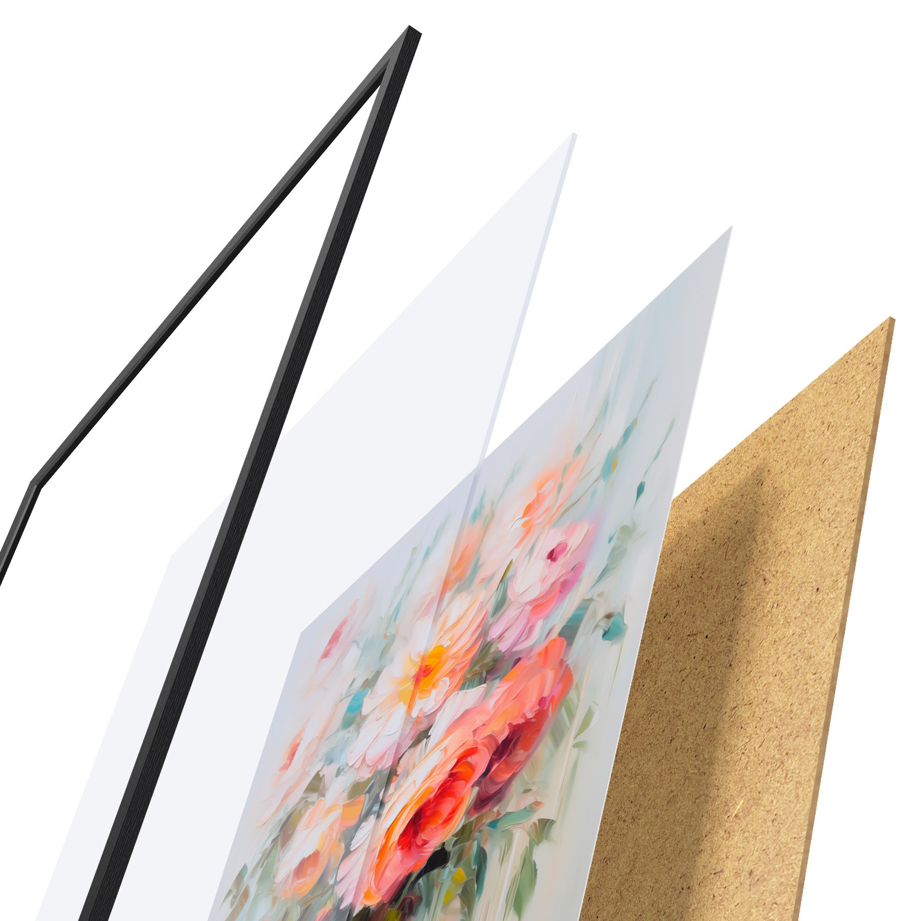 Das Poster besteht aus einem Rahmen, Plexiglas, einem gedruckten Bild und einer Rückwand aus Spanplatten. Dank der Halterungen auf der Rückseite kann das Poster sofort an die Wand gehängt werden.
