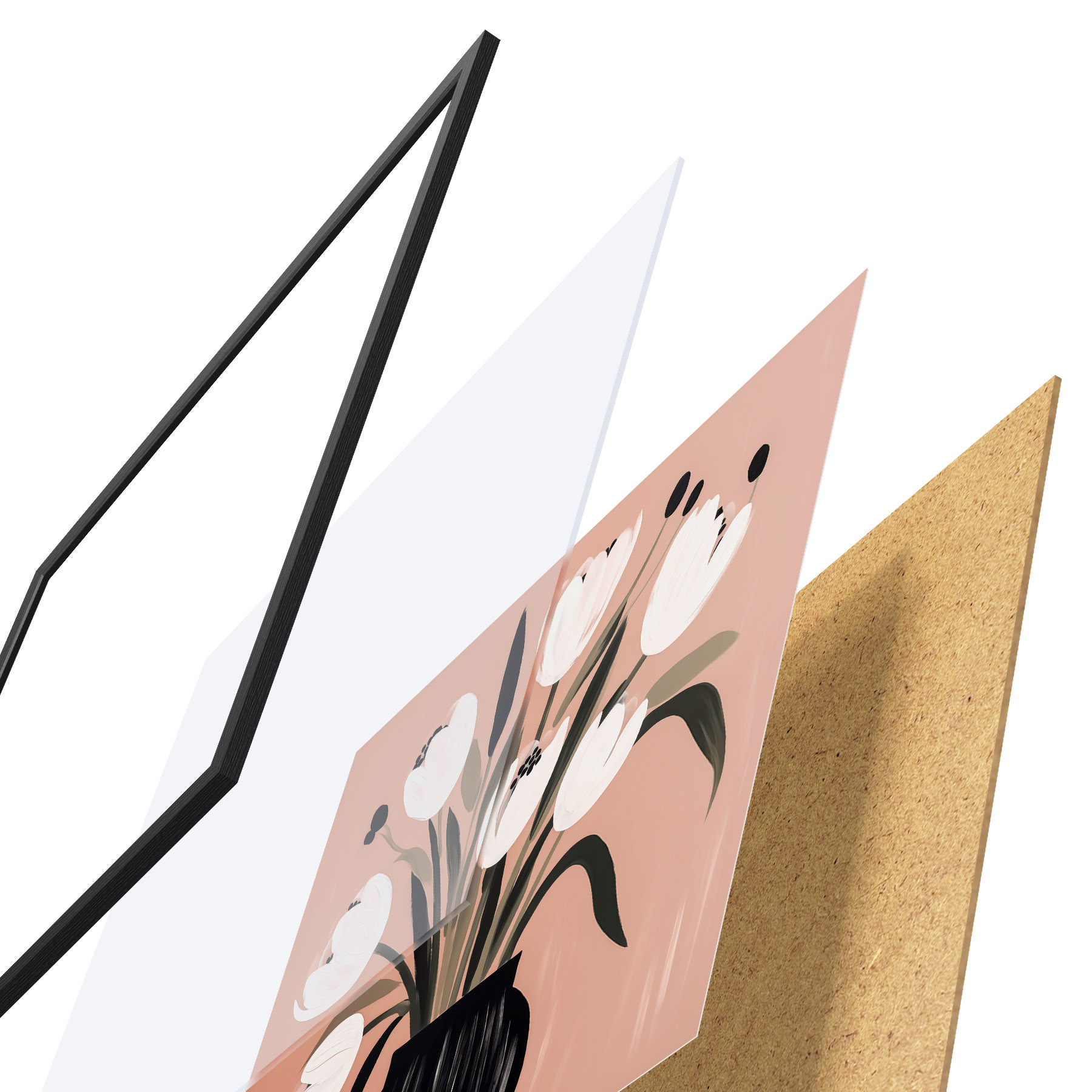 Das Poster besteht aus einem Rahmen, Plexiglas, einem gedruckten Bild und einer Rückwand aus Spanplatten. Dank der Halterungen auf der Rückseite kann das Poster sofort an die Wand gehängt werden.