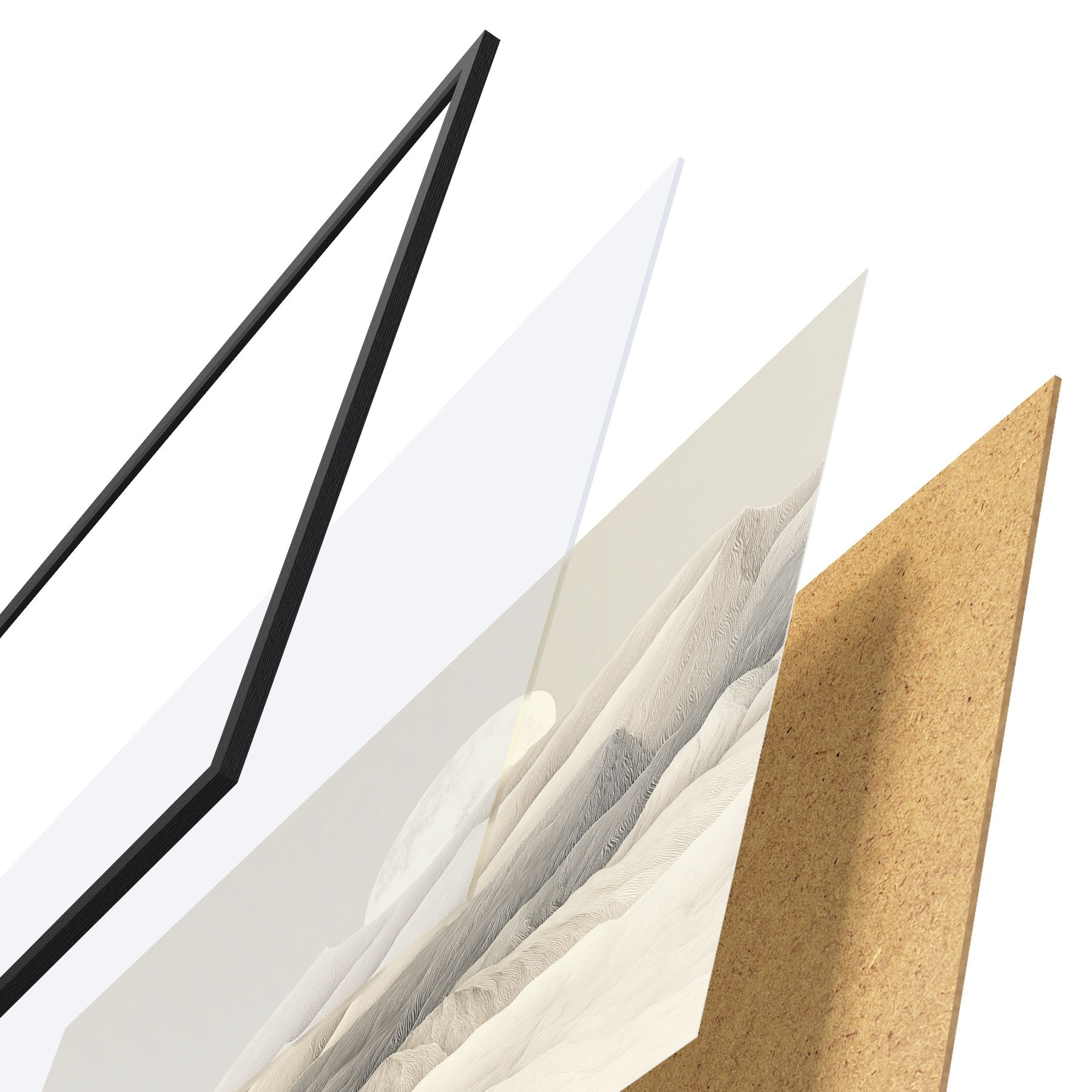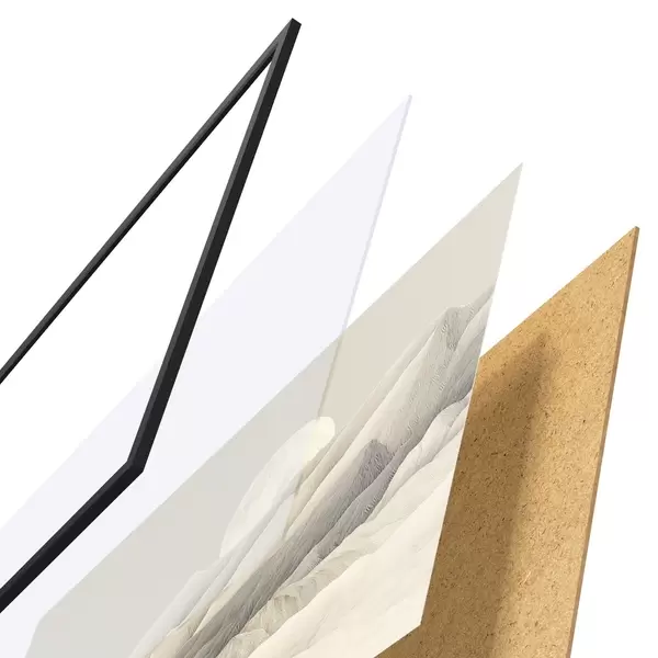 Das Poster besteht aus einem Rahmen, Plexiglas, einem gedruckten Bild und einer Rückwand aus Spanplatten. Dank der Halterungen auf der Rückseite kann das Poster sofort an die Wand gehängt werden.