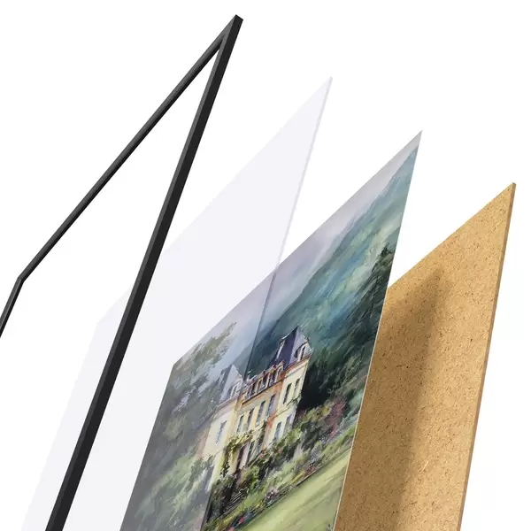 Das Poster besteht aus einem Rahmen, Plexiglas, einem gedruckten Bild und einer Rückwand aus Spanplatten. Dank der Halterungen auf der Rückseite kann das Poster sofort an die Wand gehängt werden.
