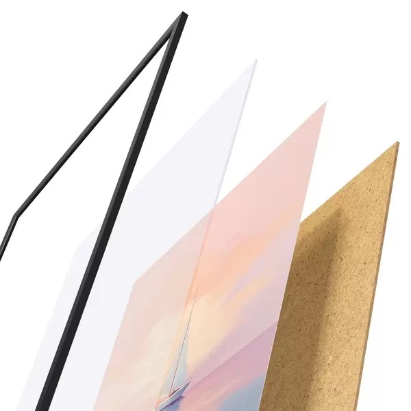 Das Poster besteht aus einem Rahmen, Plexiglas, einem gedruckten Bild und einer Rückwand aus Spanplatten. Dank der Halterungen auf der Rückseite kann das Poster sofort an die Wand gehängt werden.
