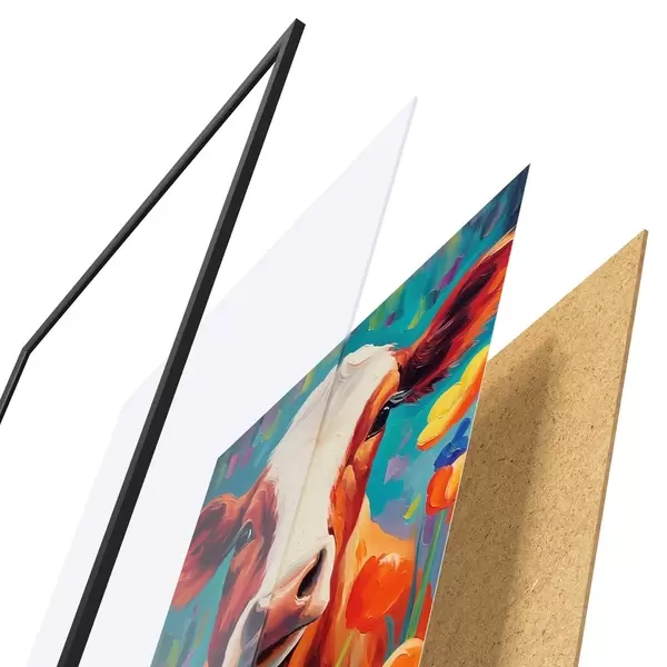 Das Poster besteht aus einem Rahmen, Plexiglas, einem gedruckten Bild und einer Rückwand aus Spanplatten. Dank der Halterungen auf der Rückseite kann das Poster sofort an die Wand gehängt werden.