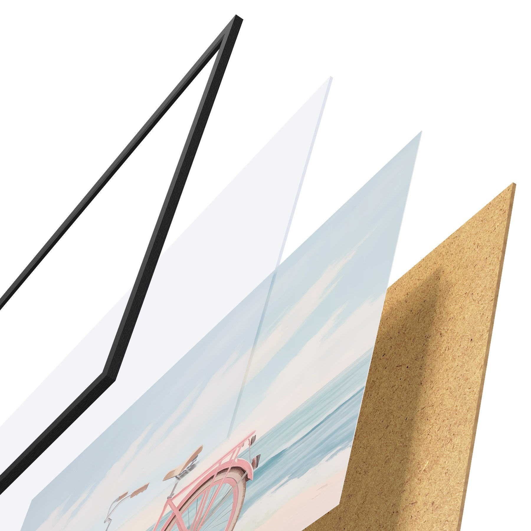 Das Poster besteht aus einem Rahmen, Plexiglas, einem gedruckten Bild und einer Rückwand aus Spanplatten. Dank der Halterungen auf der Rückseite kann das Poster sofort an die Wand gehängt werden.