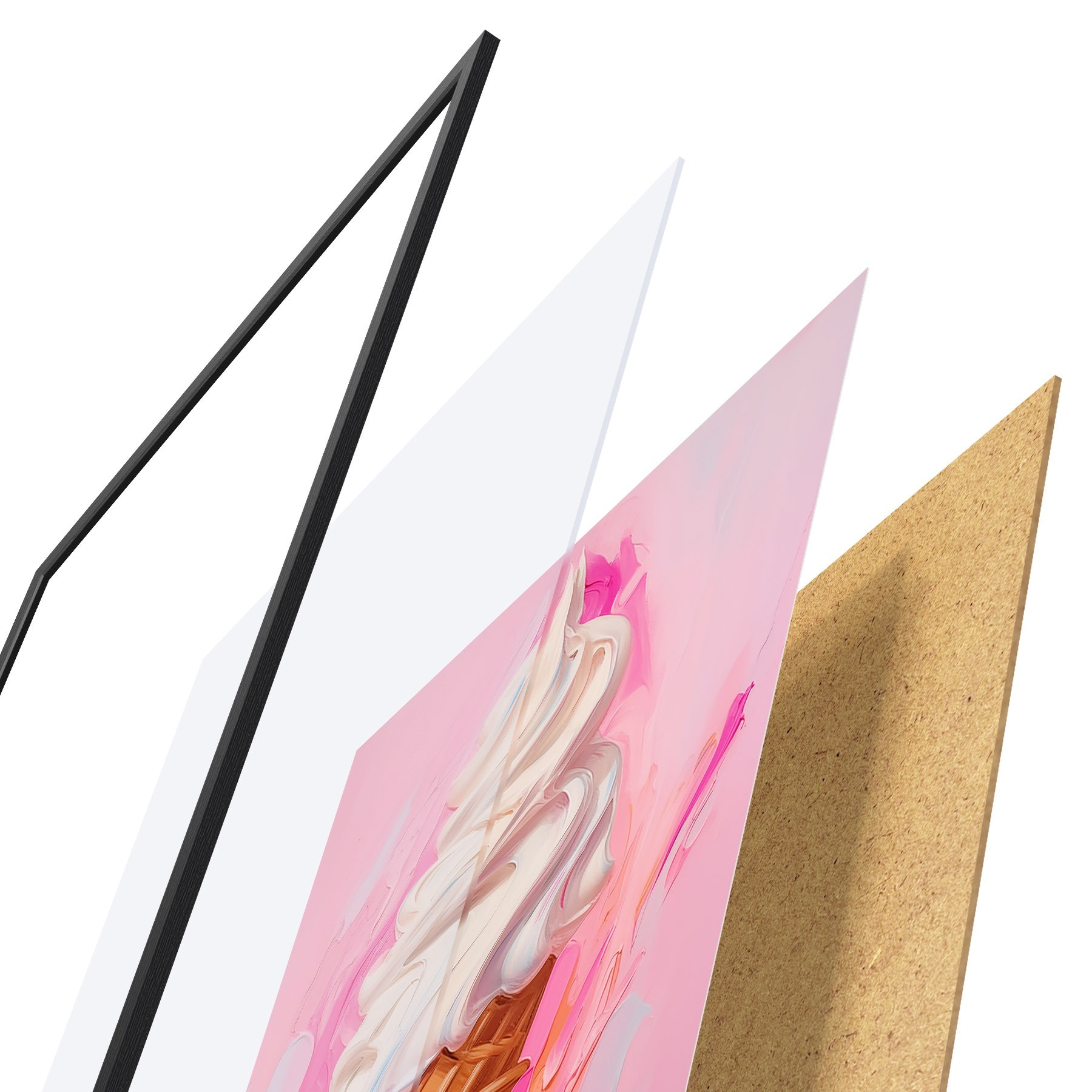 Das Poster besteht aus einem Rahmen, Plexiglas, einem gedruckten Bild und einer Rückwand aus Spanplatten. Dank der Halterungen auf der Rückseite kann das Poster sofort an die Wand gehängt werden.