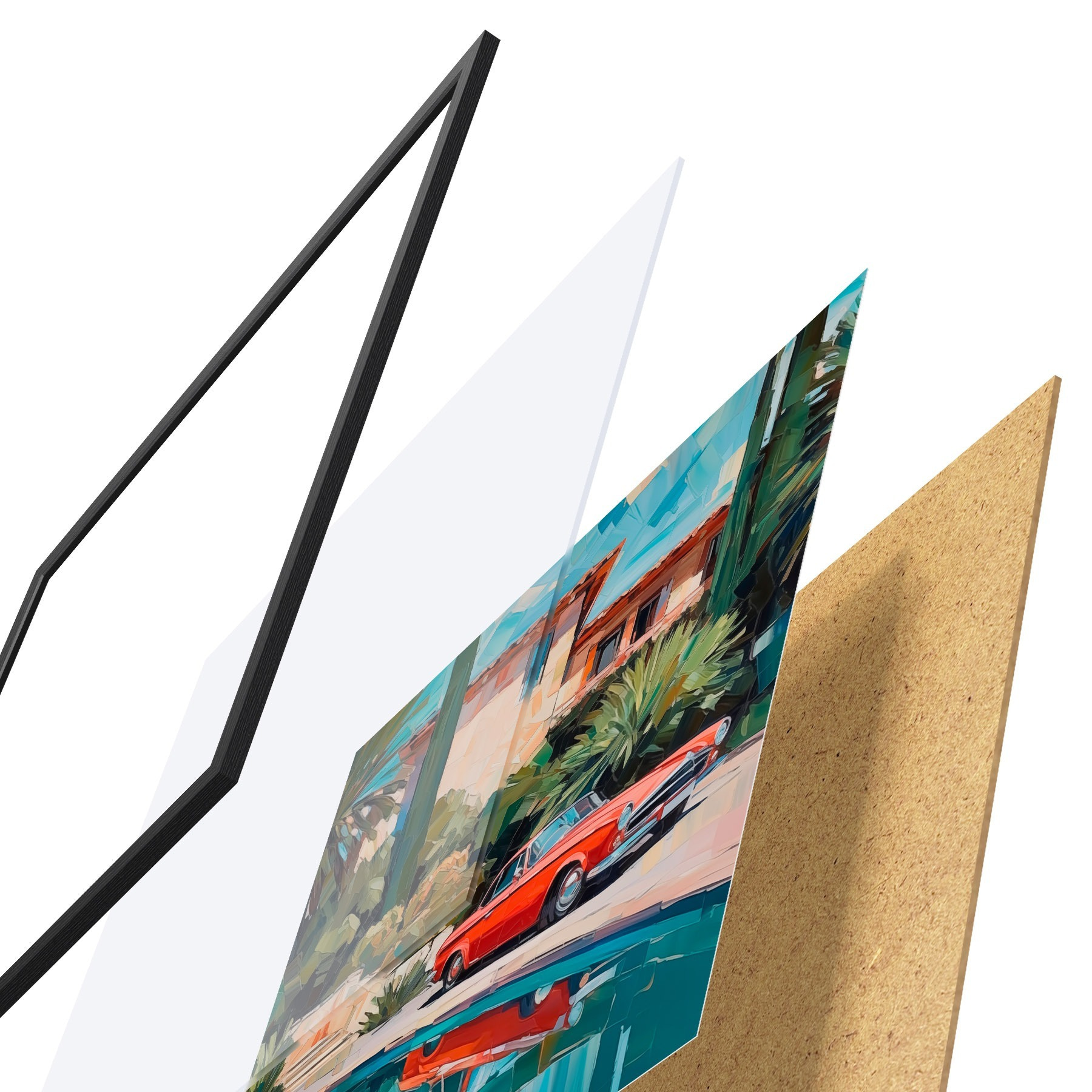 Das Poster besteht aus einem Rahmen, Plexiglas, einem gedruckten Bild und einer Rückwand aus Spanplatten. Dank der Halterungen auf der Rückseite kann das Poster sofort an die Wand gehängt werden.