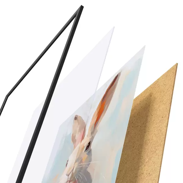 Das Poster besteht aus einem Rahmen, Plexiglas, einem gedruckten Bild und einer Rückwand aus Spanplatten. Dank der Halterungen auf der Rückseite kann das Poster sofort an die Wand gehängt werden.