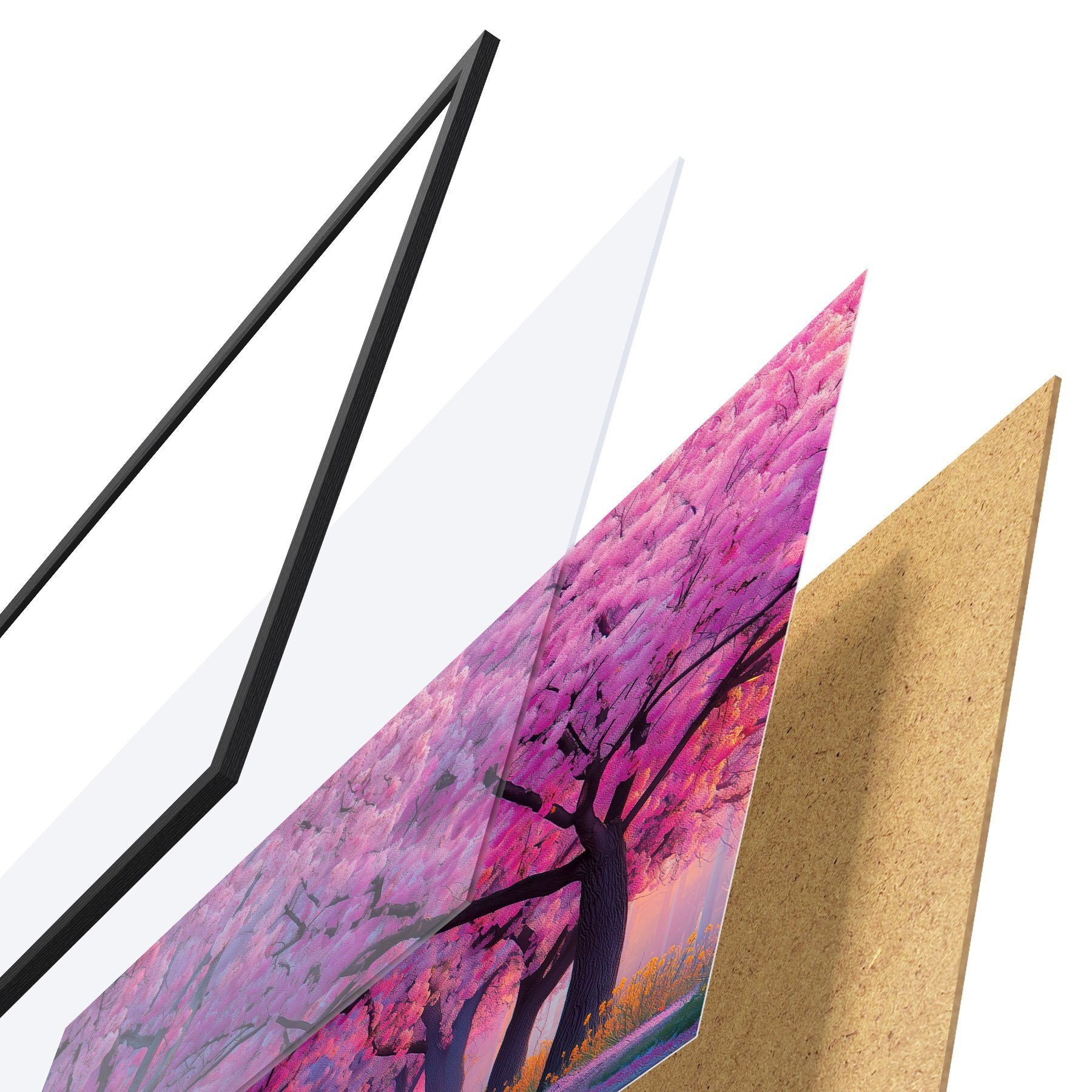 Das Poster besteht aus einem Rahmen, Plexiglas, einem gedruckten Bild und einer Rückwand aus Spanplatten. Dank der Halterungen auf der Rückseite kann das Poster sofort an die Wand gehängt werden.