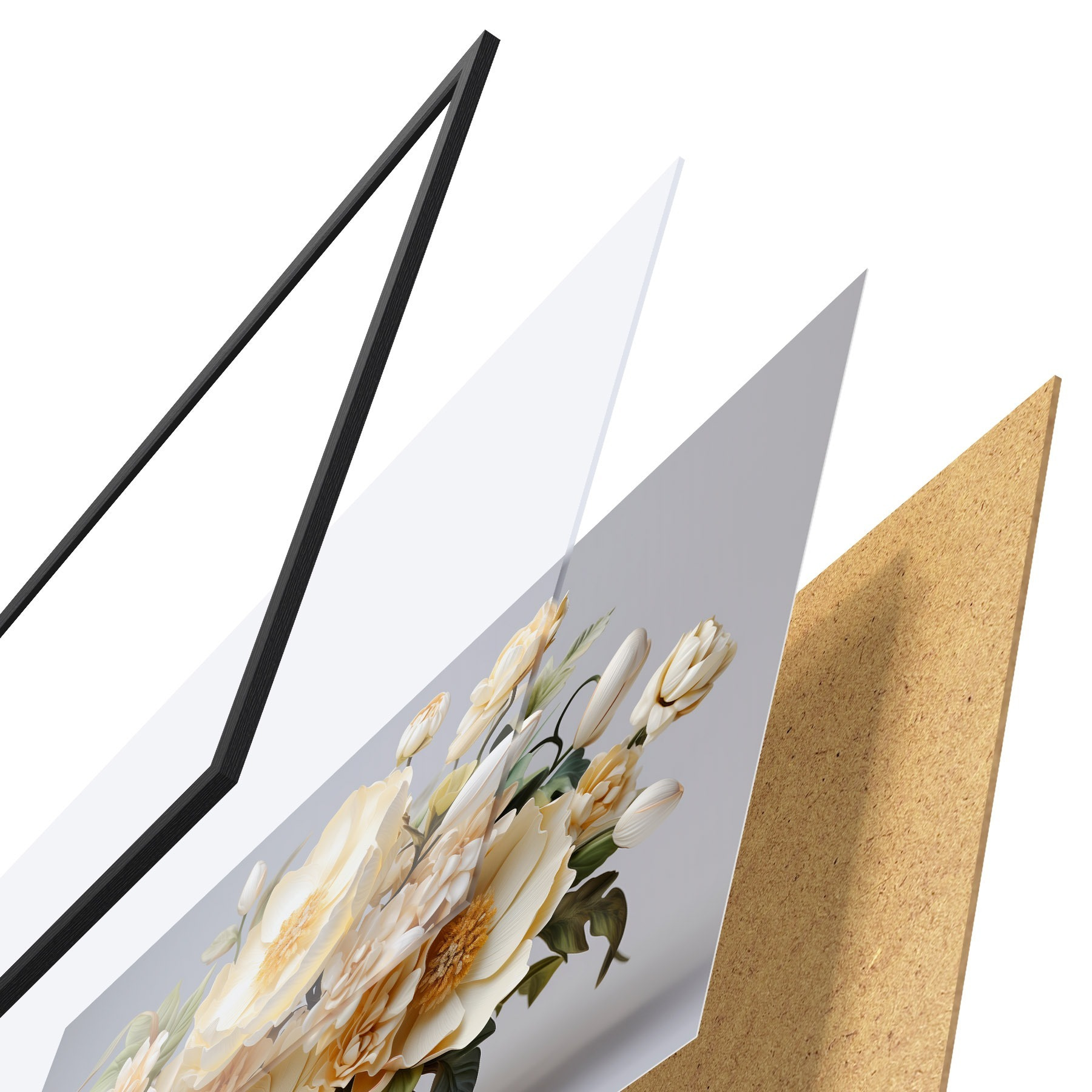 Das Poster besteht aus einem Rahmen, Plexiglas, einem gedruckten Bild und einer Rückwand aus Spanplatten. Dank der Halterungen auf der Rückseite kann das Poster sofort an die Wand gehängt werden.