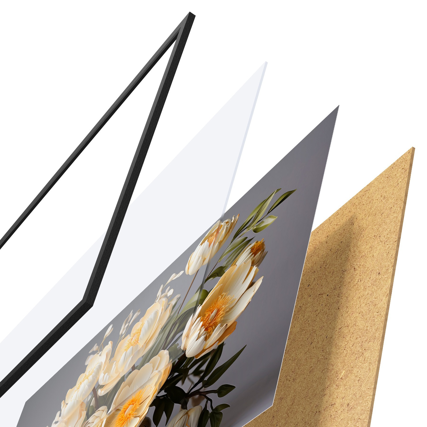 Das Poster besteht aus einem Rahmen, Plexiglas, einem gedruckten Bild und einer Rückwand aus Spanplatten. Dank der Halterungen auf der Rückseite kann das Poster sofort an die Wand gehängt werden.