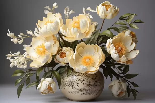 Poster Zarte Blumen mit gelben Zentren in einer gemusterten Vase Nr f44847