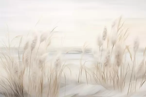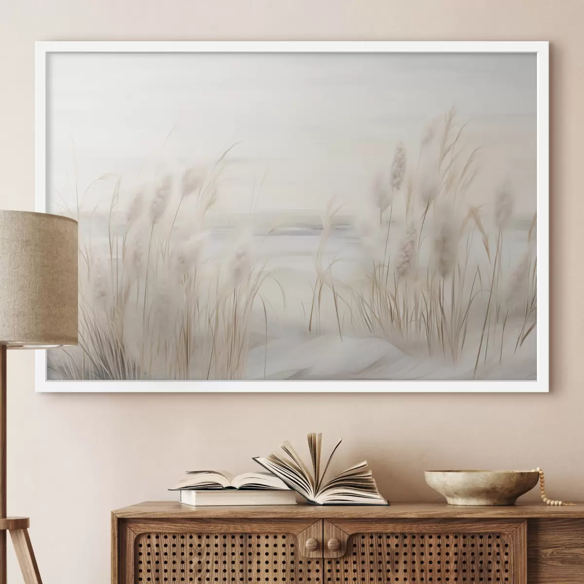 Poster Beigefarbenes Schilf im Vordergrund, mit Samenköpfen, weich und zart, ein verschwommener Hintergrund und ein heller Himmel Nr f44851