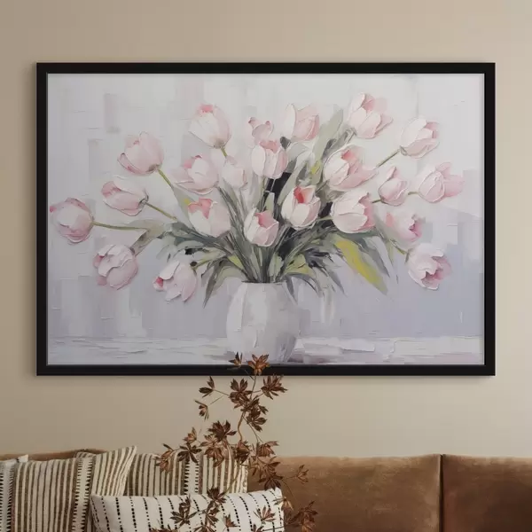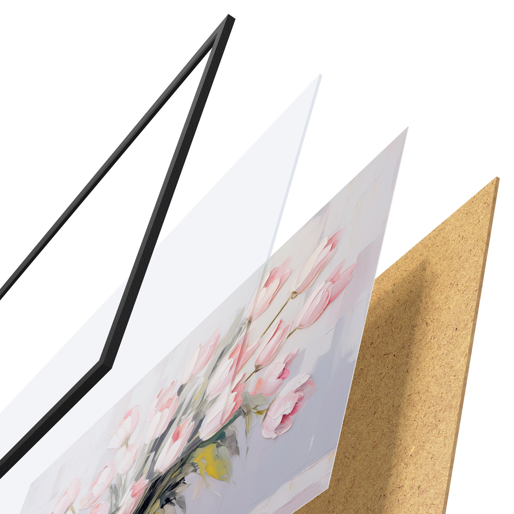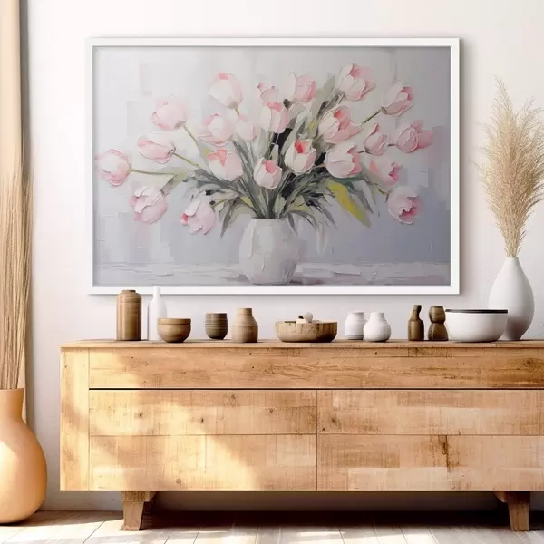 Poster Eine Vase mit rosa Tulpen, grüne Blätter, hellgrauer Hintergrund, Ölgemälde Stil, dicke Pinselstriche Nr f44852