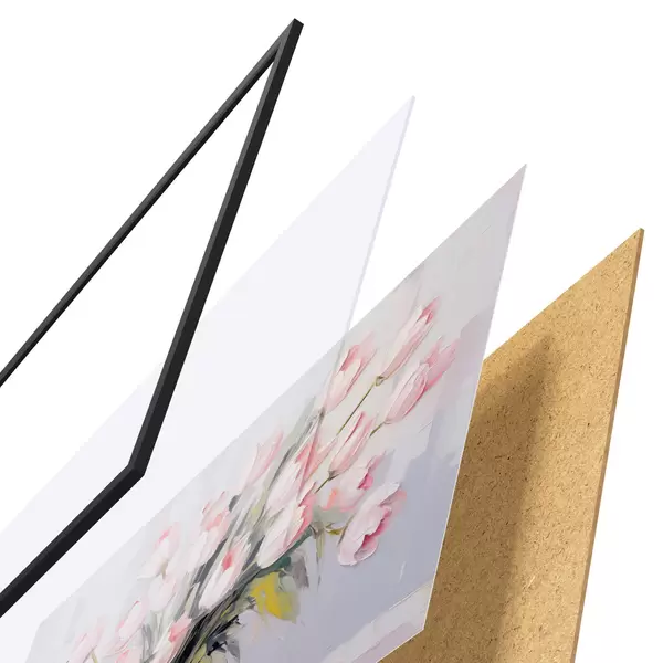 Das Poster besteht aus einem Rahmen, Plexiglas, einem gedruckten Bild und einer Rückwand aus Spanplatten. Dank der Halterungen auf der Rückseite kann das Poster sofort an die Wand gehängt werden.