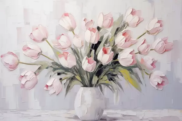 Poster Eine Vase mit rosa Tulpen, grüne Blätter, hellgrauer Hintergrund, Ölgemälde Stil, dicke Pinselstriche Nr f44852
