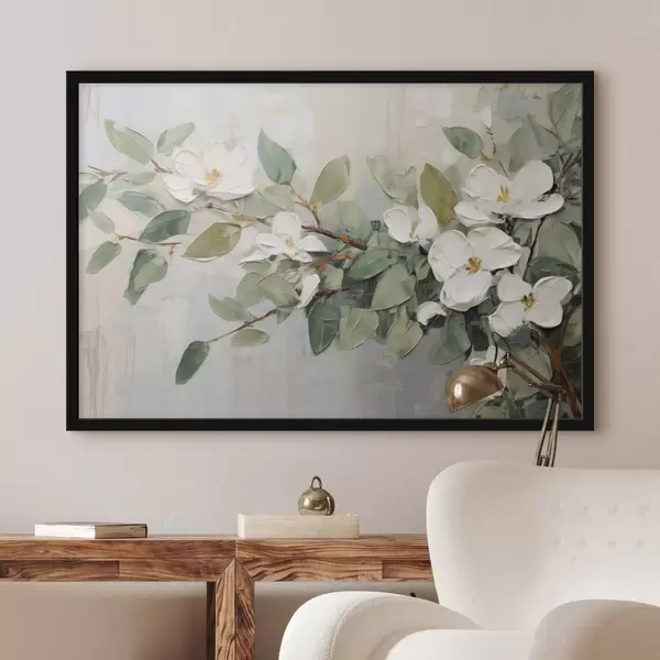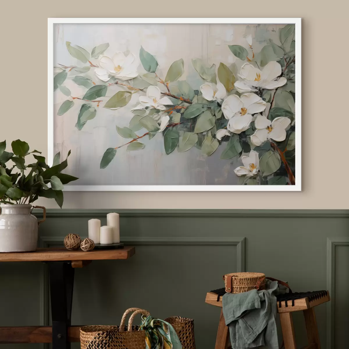 Poster Magnolienblüten mit grünen Blättern auf einem Zweig, pastos strukturierter Stil, weiche Farbpalette Nr f44853