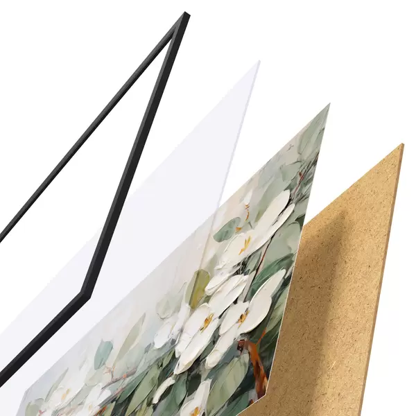 Das Poster besteht aus einem Rahmen, Plexiglas, einem gedruckten Bild und einer Rückwand aus Spanplatten. Dank der Halterungen auf der Rückseite kann das Poster sofort an die Wand gehängt werden.