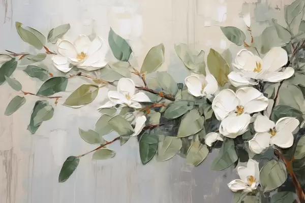Poster Magnolienblüten mit grünen Blättern auf einem Zweig, pastos strukturierter Stil, weiche Farbpalette Nr f44853