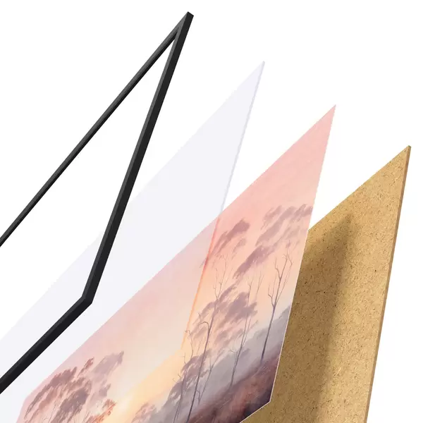 Das Poster besteht aus einem Rahmen, Plexiglas, einem gedruckten Bild und einer Rückwand aus Spanplatten. Dank der Halterungen auf der Rückseite kann das Poster sofort an die Wand gehängt werden.