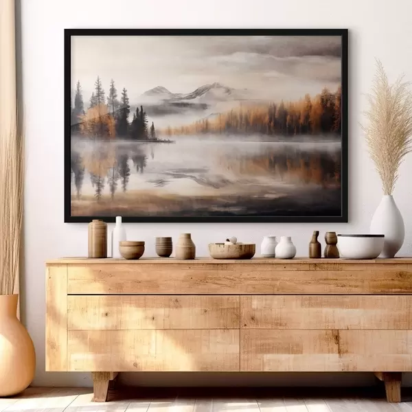 Poster Eine neblige, strukturierte Seenlandschaft mit Kiefern und Bergen, wolkenverhangener grauer Himmel Nr f44856