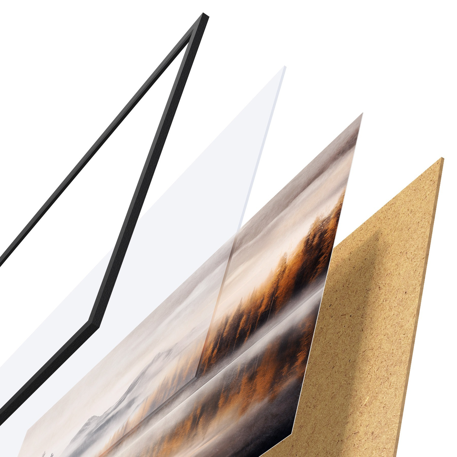 Das Poster besteht aus einem Rahmen, Plexiglas, einem gedruckten Bild und einer Rückwand aus Spanplatten. Dank der Halterungen auf der Rückseite kann das Poster sofort an die Wand gehängt werden.