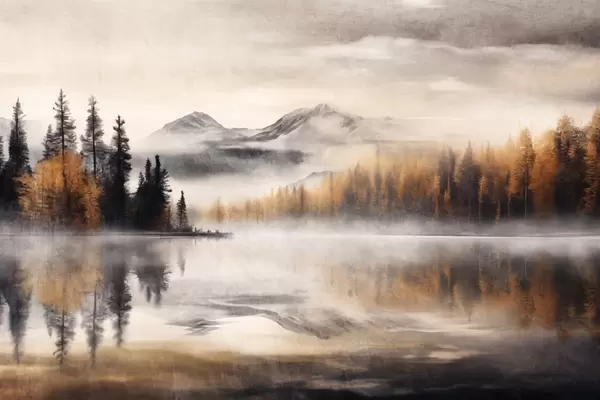 Poster Eine neblige, strukturierte Seenlandschaft mit Kiefern und Bergen, wolkenverhangener grauer Himmel f44856
