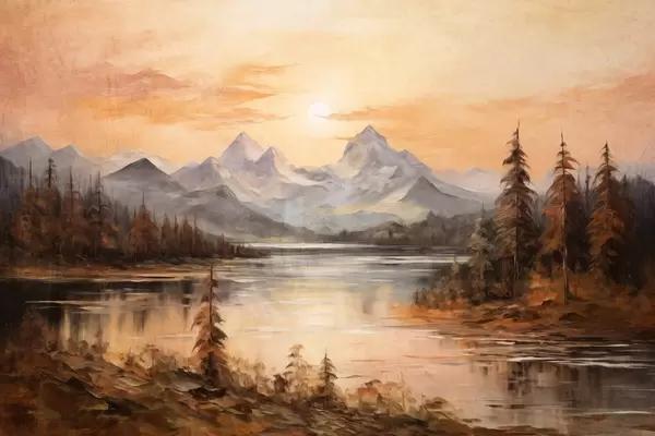 Poster Landschaft mit einem See, umgeben von Bäumen und Bergen im Hintergrund, orangefarbener Himmel mit Sonne Nr f44857