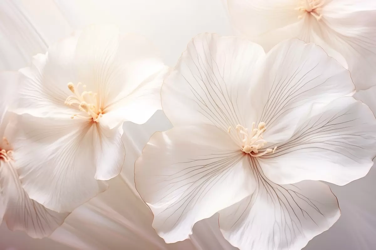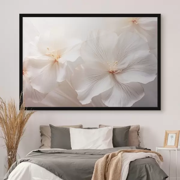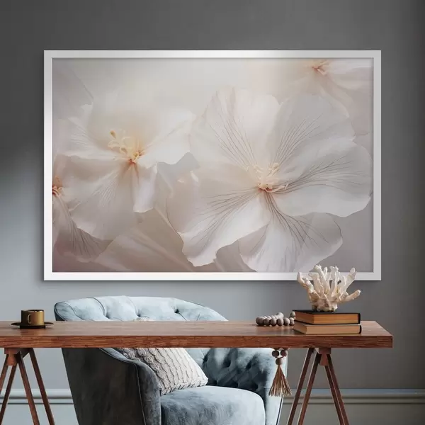 Poster Zarte weiße Blumen mit Blütenblättern und zarten, pastellfarbenen Zentren, die eine verträumte und ätherische Blumenkunst schaffen f44858