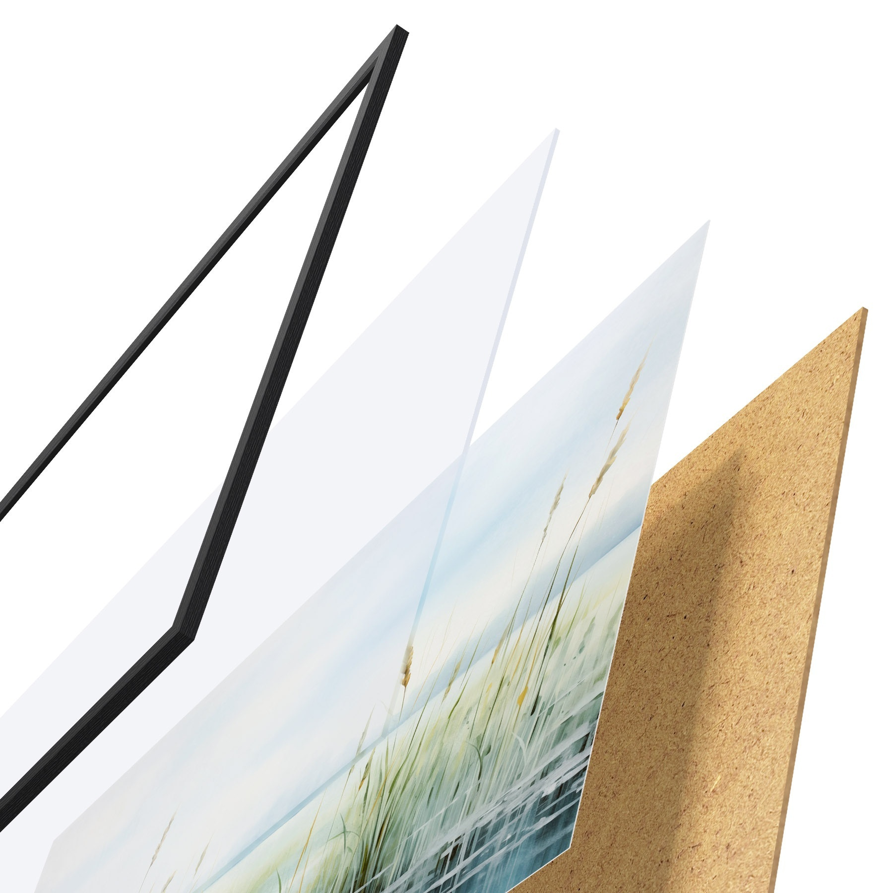 Das Poster besteht aus einem Rahmen, Plexiglas, einem gedruckten Bild und einer Rückwand aus Spanplatten. Dank der Halterungen auf der Rückseite kann das Poster sofort an die Wand gehängt werden.